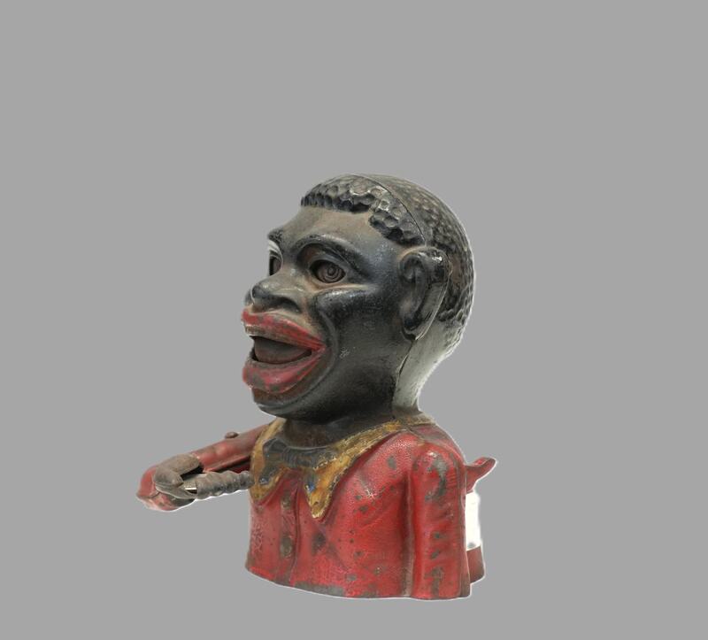 The red and yellow vintage Jolly Negro bank features a caricature of a smiling Black man, embodying the racially insensitive stereotypes prevalent in early 20th-century America. Designed as a coin bank, it reflects the era's problematic representation of African Americans in popular culture.