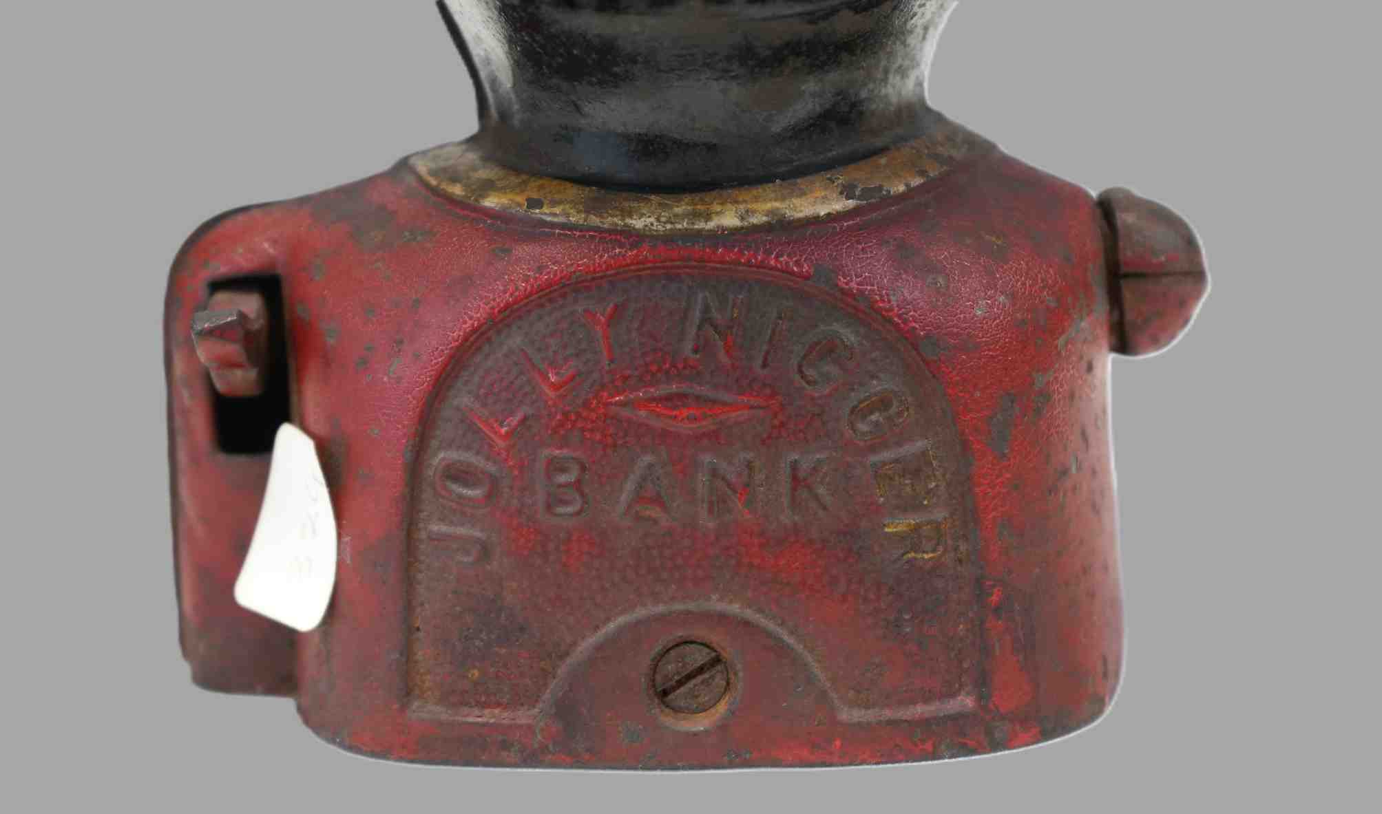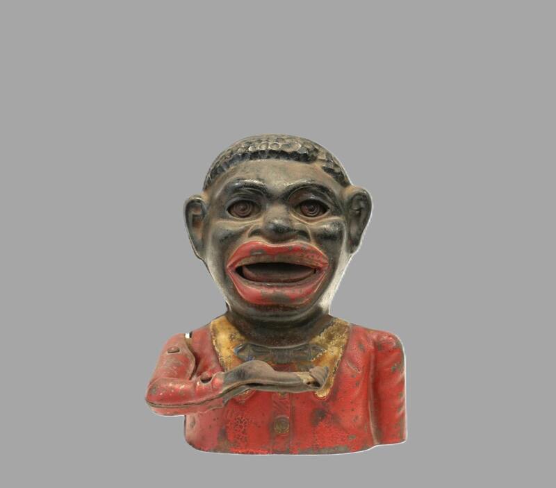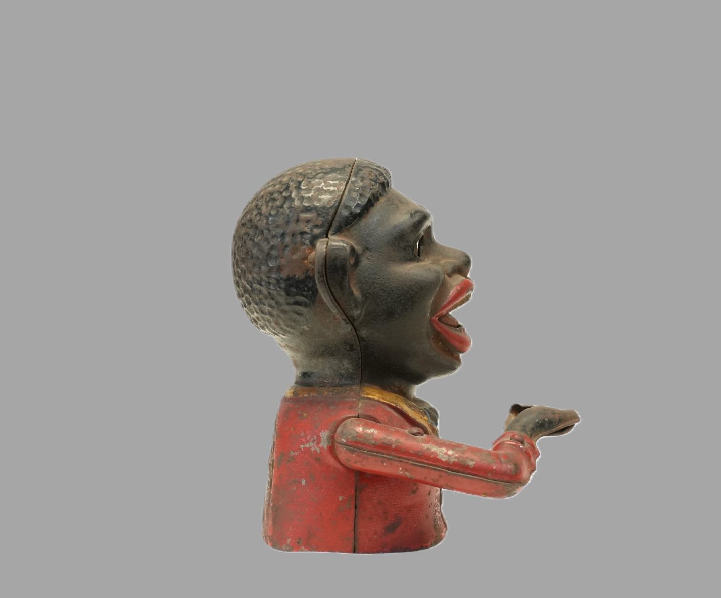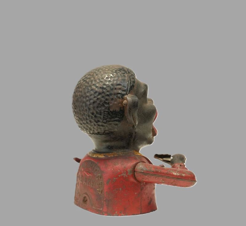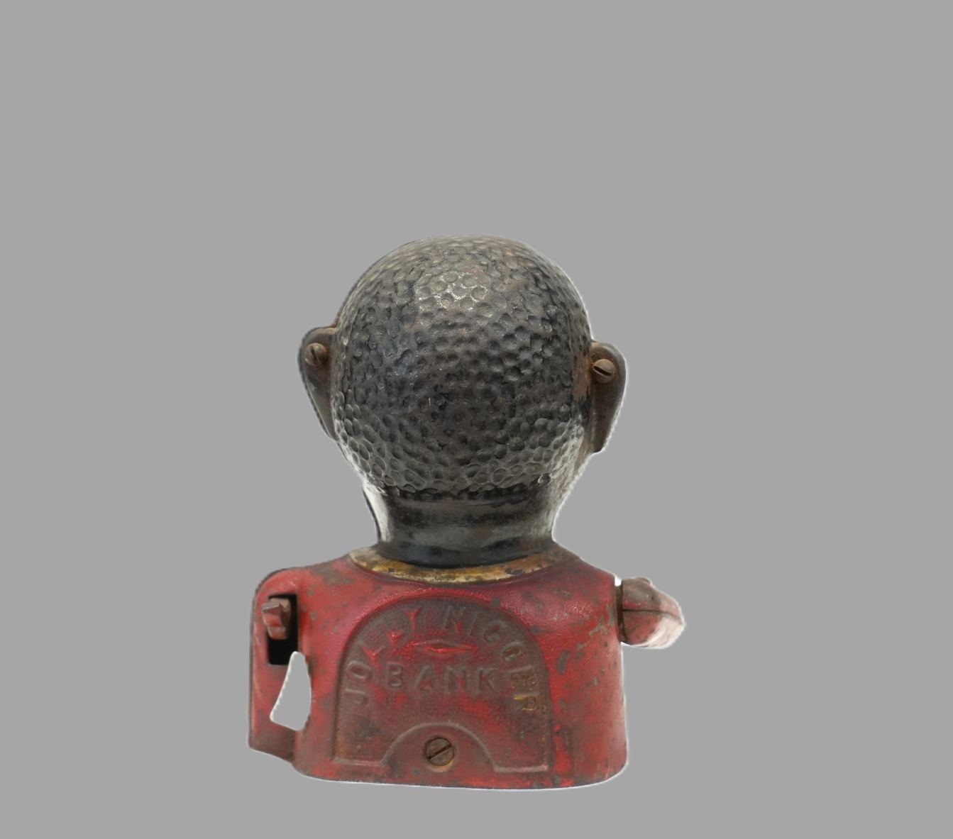 The red and yellow vintage Jolly Negro bank features a caricature of a smiling Black man, embodying the racially insensitive stereotypes prevalent in early 20th-century America. Designed as a coin bank, it reflects the era's problematic representation of African Americans in popular culture.