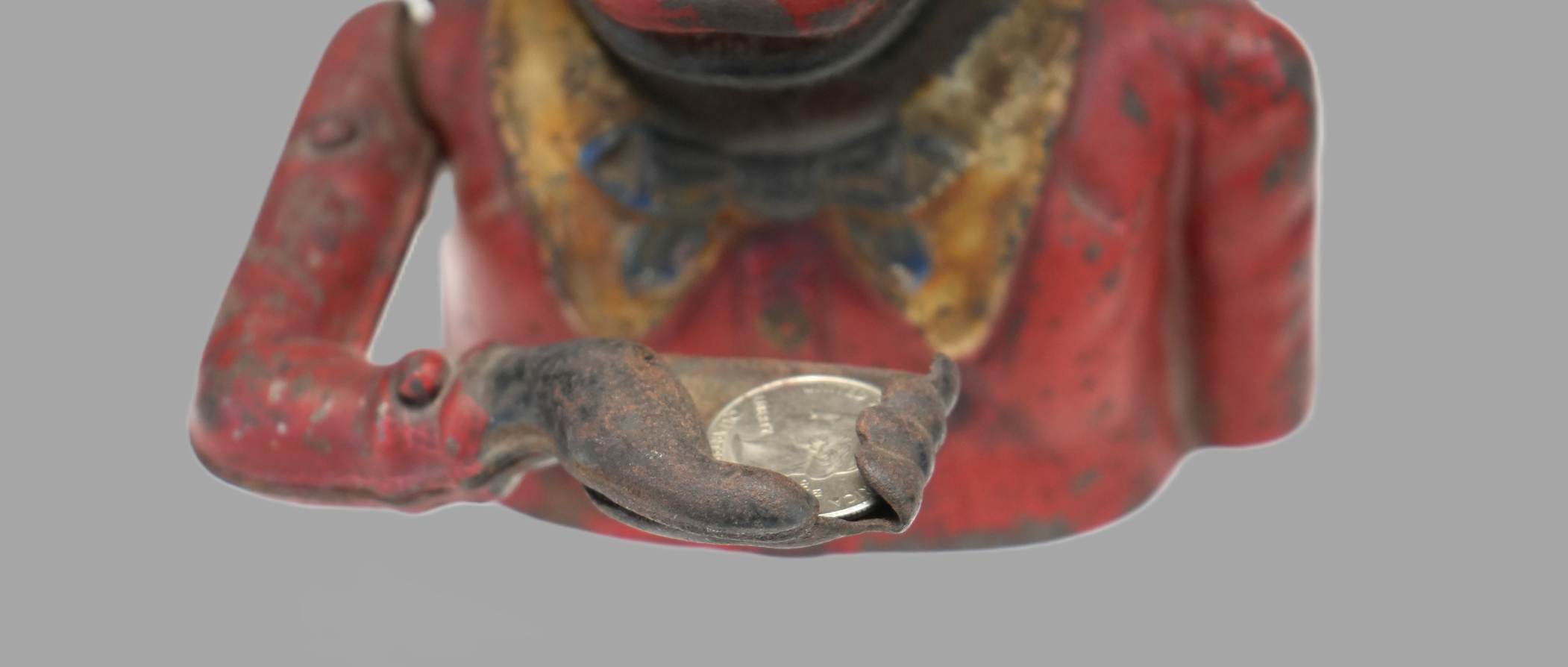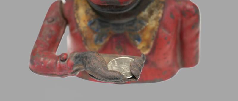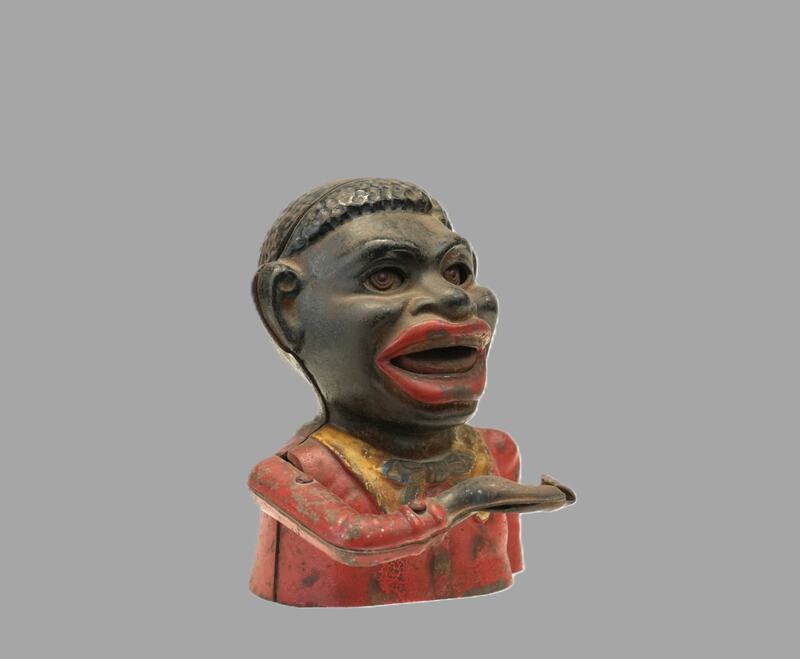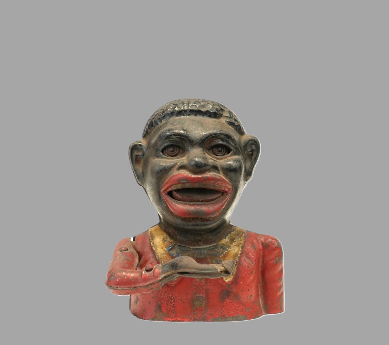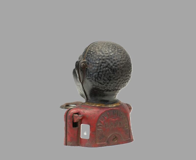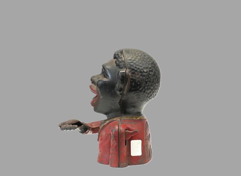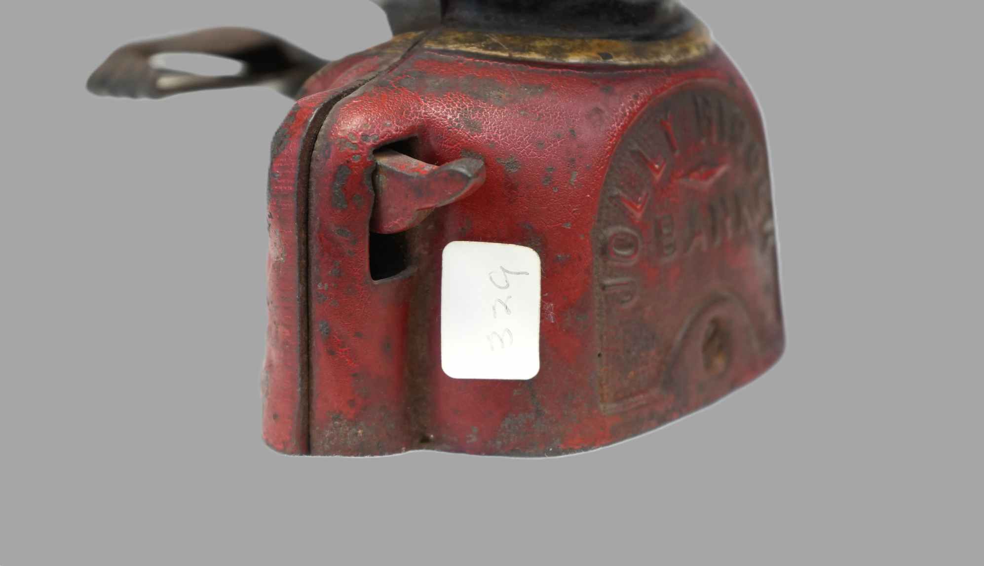 The red and yellow vintage Jolly Negro bank features a caricature of a smiling Black man, embodying the racially insensitive stereotypes prevalent in early 20th-century America. Designed as a coin bank, it reflects the era's problematic representation of African Americans in popular culture.